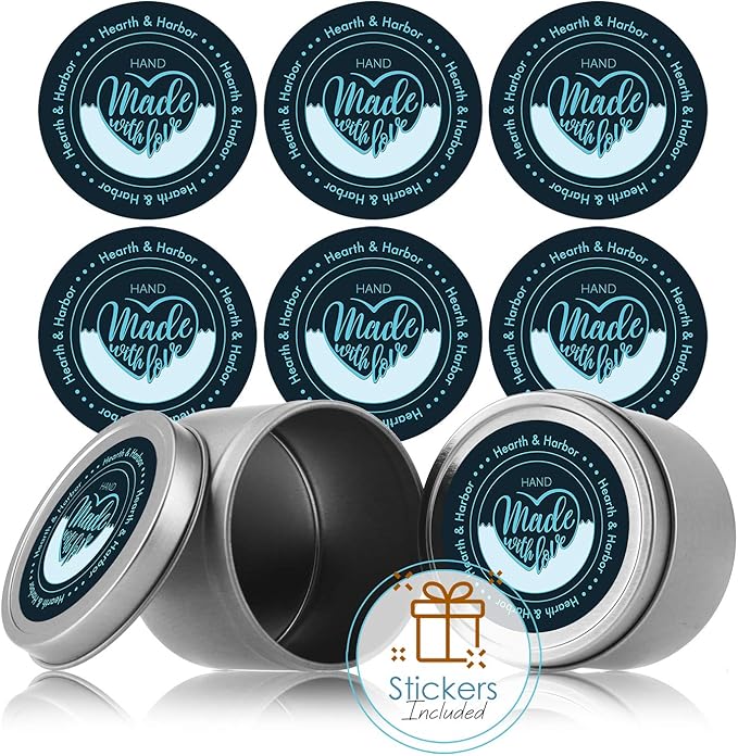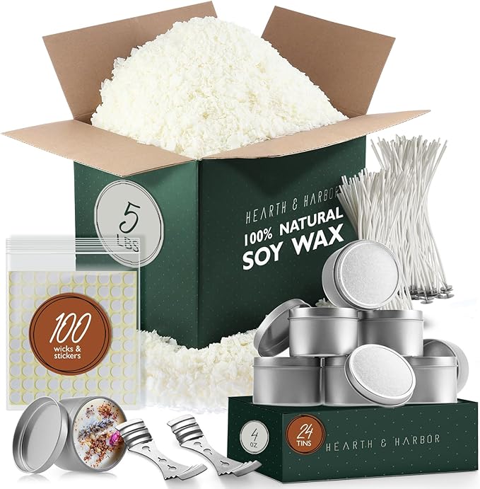 Hearth & Harbor Natural Soy Wax and DIY Candle Making Supplies – 5 Lbs. Soy Candle Wax Flakes, Candle Tin Cans with Lid 24 Pack – 4 oz., 100 Cotton Wicks, and 2 Metal Centering Device